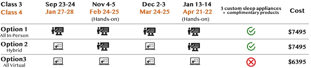 2 The second option we call it a hybrid. It includes two sessions that are virtual and interactive and two sessions that are in-person. This means you can get the lectures and learn from the comfort of your own home, and still participate in both the TMD and sleep hands-on portion of the course at the in-person sessions.